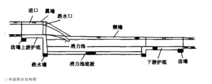 單級(jí)跌水:在落差較小的情況下,一般3~5m的落差時(shí),采用單級(jí)跌水。