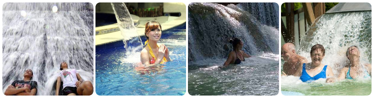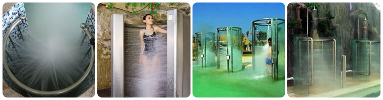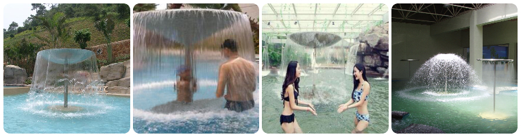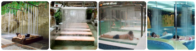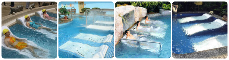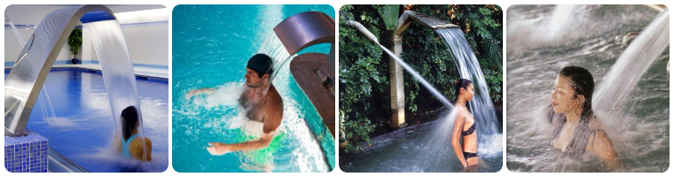 3.傘形瀑布浴:利用由上向下拋物線之動力水柱,沖擊上半身之頭、頸、肩、背部等部分,進行中性按摩,消除肌肉的緊張性。效果:快速醒腦,松弛上半身肌肉,消除肩頭酸痛之癥狀。